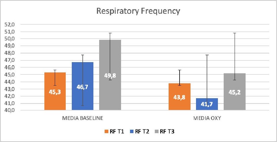 Indeed, RF (respiratory frequency) was significantly lower (P < 0.01) at BASELINE T0 with 47.3 ± 10.1 (T0) than at Texp (O2; 8 BREATHS) with 43.6 ± 9.0.